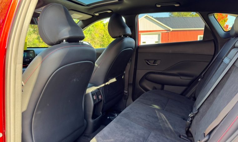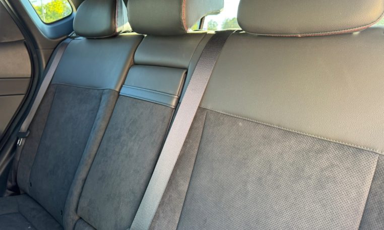 • Premium Interior: Features leather and suede combination upholstery with red accents, a leather-wrapped steering wheel, and a power-operated sunroof.